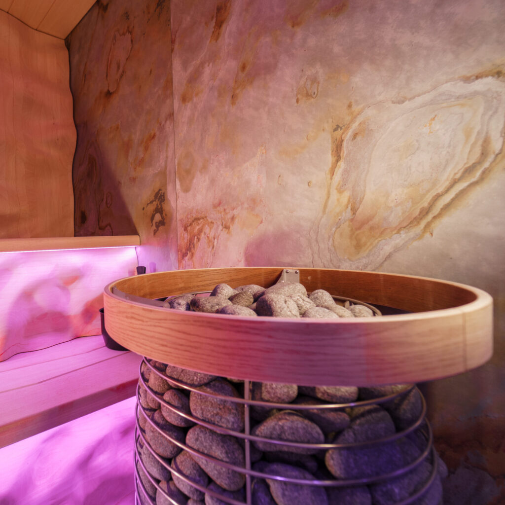 Het interieur wordt gedomineerd door een uitgesproken 3D-achterwand en verticale bank panelen, gecombineerd met vloeiend vormgegeven Wave-banken in hoogwaardig Ayous hout. De zijwanden in gemarmerd steen fineer uit Oostenrijk zorgen voor een omsloten en rustgevende ruimtelijkheid. Centraal in de ruimte staat een eivormige saunaoven met zichtbare stenen, die zowel functioneel als visueel het hart van de sauna vormt. In zijn geheel vertegenwoordigt deze realisatie een bekroonde prestatie waarin esthetiek, techniek en comfort op hoog niveau samenkomen.