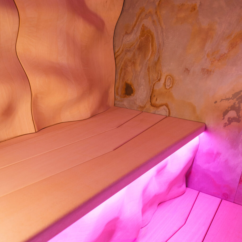Achter de grijze glazen voorwand bevindt zich een volledig op maat ontworpen sauna omgeving waarin licht, materiaal en functionaliteit zorgvuldig op elkaar zijn afgestemd. Dynamische RGB-verlichting maakt het mogelijk om verschillende sauna-intensiteiten en sferen te creëren, gaande van krachtige infusie sessies tot mildere biosauna-instellingen. Licht fungeert hier niet alsdecoratief element, maar als een strategisch onderdeel van de gebruikerservaring.